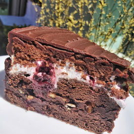 Tres bizcochuelos de chocolate o vainilla rellenos de 2 capas dobles de dulce de leche de coco/almendras + crema chantilly con frutos rojos congelados. Cubierta con ganache de chocolate semiamargo (semiamargo Aguila + Crema No Láctea Ledevit)